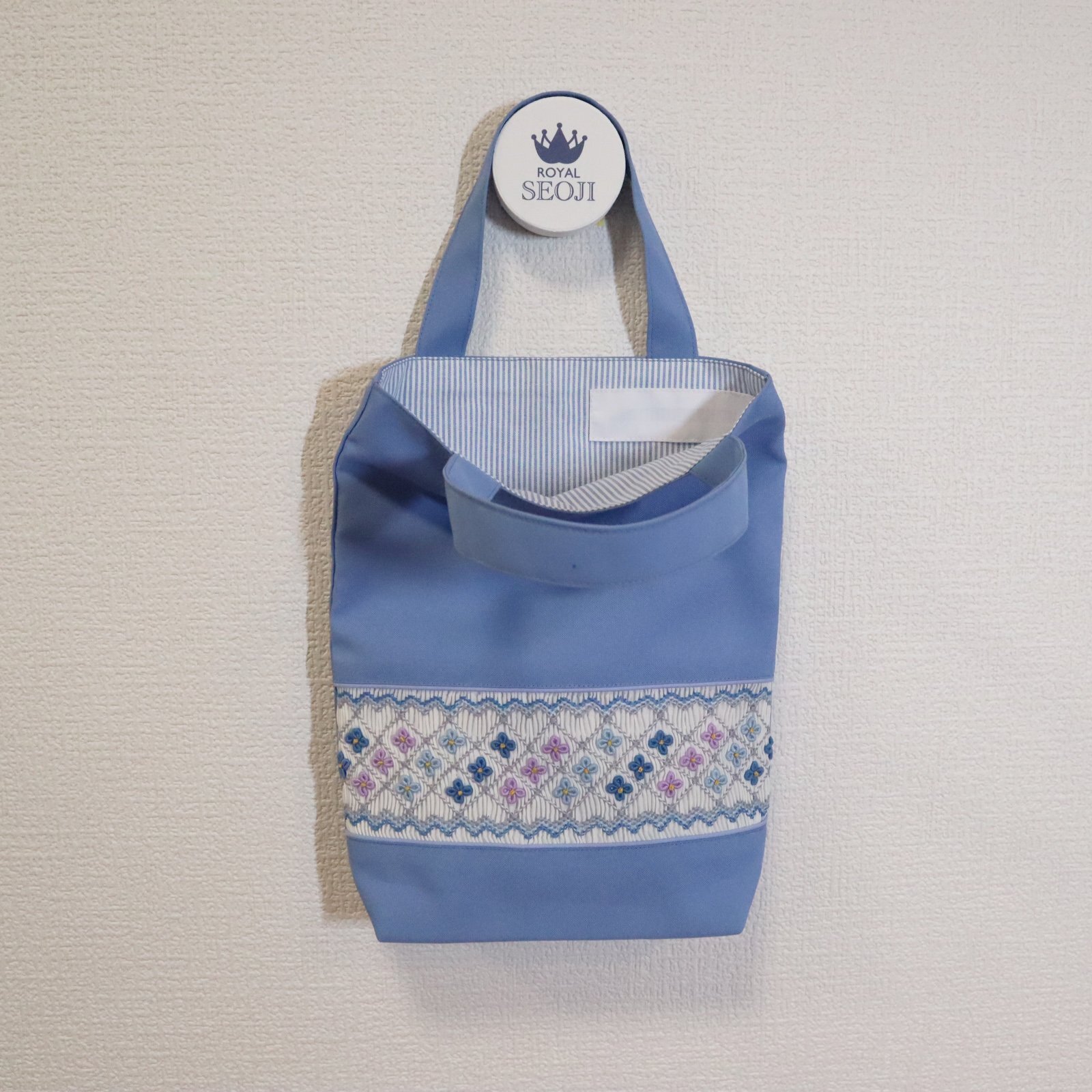 ハンドメイドのスモッキング刺繍が施されたシューズバッグです。
